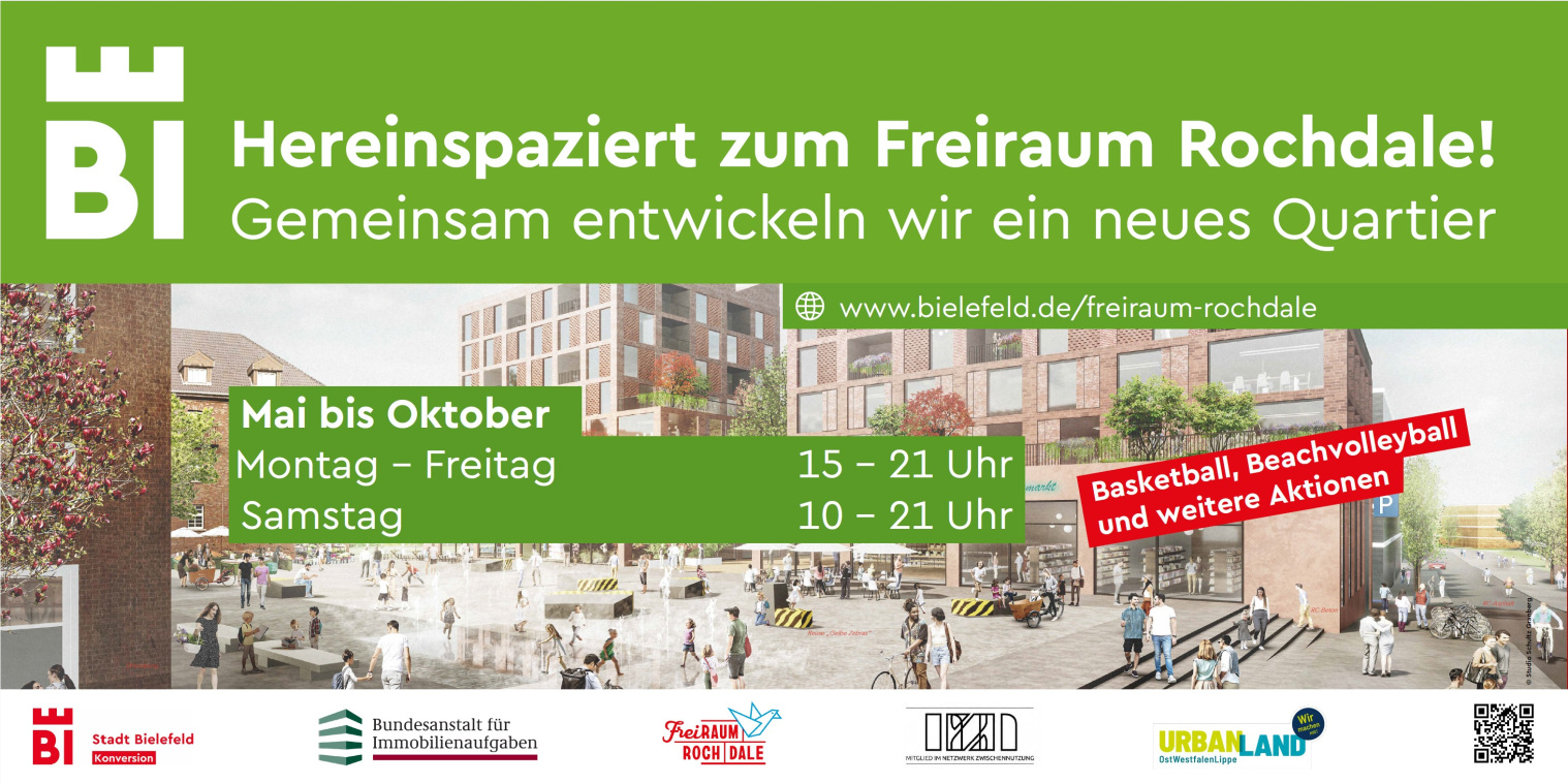 Unweit der Innenstadt laden 4,5 Hektar Fläche des ehemaligen Kasernengeländes "Rochdale Barracks“ ein zu sportlichen, kulturellen, sozialen und nachbarschaftlichen Aktivitäten. Im Rahmen der Startnutzung für die zukünftige Quartiersentwicklung ist hier Freiraum für Sport, konsumfreien Aufenthalt im Pocket-Park und die Realisierung eigener kreativer Ideen.