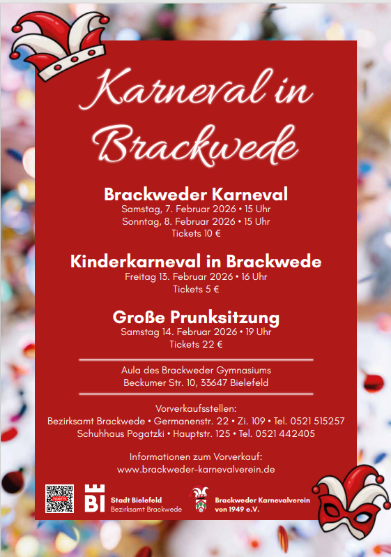 Mit einem bunten Mix aus schwungvollen Tänzen, lustigen Büttenreden und mitreißenden Schunkelrunden lädt das Bezirksamt Brackwede in Kooperation mit dem Brackweder Karnevalverein von 1949 e. V. alle Jecken – ob verkleidet oder nicht – zu einem unvergesslichen Nachmittag ein. Die Aula des Brackweder Gymnasiums verwandelt sich dafür in einen bunt geschmückten Sitzungssaal.
