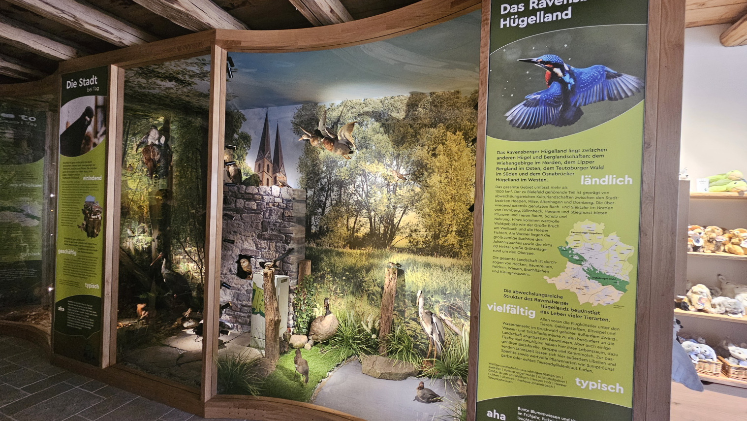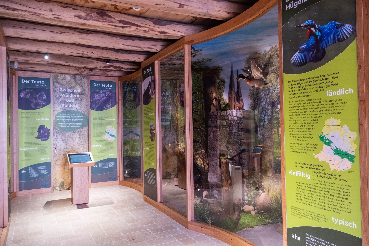 Eingebettet in sogenannte Landschaftsvitrinen wurden die Lebensräume der heimischen Tierarten in vier Bereiche aufgeteilt: das Ravensberger Hügelland, die Senne-Landschaft, der Teutoburger Wald und der urbane Lebensraum in Bielefeld. Darüber hinaus sind die Bereiche Teutoburger Wald und die Stadtlandschaft im Vergleich von Tag zu Nacht unterteilt – um zu zeigen, wie unterschiedlich das tierische Leben zu den verschiedenen Tageszeiten pulsiert. Die Ausstellung zeigt dabei besonders viele kleine Tierarten, die nicht im Tierpark gehalten werden. Außerdem ermöglicht die Schau, alle Tiere in Ruhe und im Detail betrachten zu können.