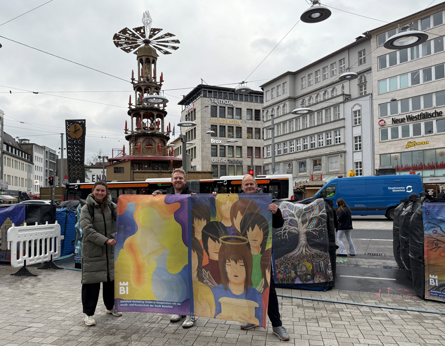 Die Illustrationen wurden auf wetterfeste Banner gedruckt und anschließend an ausgewählten Durchfahrtssperren angebracht. So entstehen an den entsprechenden Standorten kleine Kunstinseln, die als Präsentationsfläche für Kunst im öffentlichen Raum dienen. „Seit vielen Jahren widmen sich unsere Vorstudentinnen und Vorstudenten winterlichen Themen. Ihr künstlerischer Fundus ist enorm. Ich freue mich sehr, dass ihre Arbeiten nun in einem so sichtbaren Rahmen präsentiert werden und die Durchfahrtssperren in kleine Kunstinseln verwandeln", so Schulze. Und Miriam Köpke, Direktorin der Musik- und Kunstschule, ergänzt: „Wir freuen uns sehr, dass die kreative Arbeit unserer Schülerinnen und Schüler auf dem diesjährigen Weihnachtsmarkt sichtbar wird. Die Möglichkeit, ihre Illustrationen in diesem Rahmen zu zeigen, ist für die jungen Künstlerinnen und Künstler etwas Besonderes. Wir sind Bielefeld Marketing dankbar für diese wertschätzende Zusammenarbeit.“