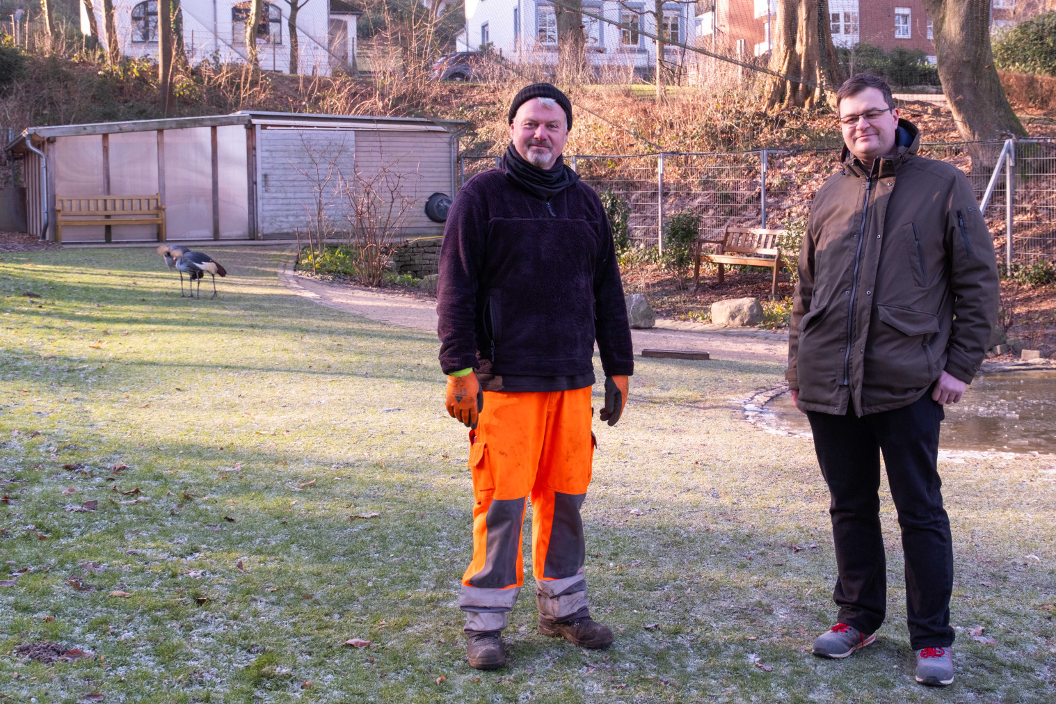 Stellen das Zootier des Jahres in Bielefeld vor (v.l.): Christian Ebert (Vorarbeiter im Bürgerpark, UWB) und Tierparkleiter Dr. Benjamin Ibler. Foto: Stadt Bielefeld/UWB