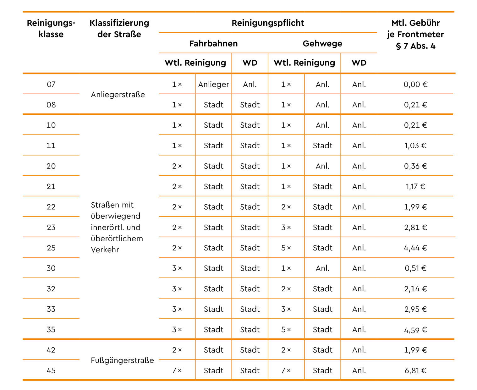 Wenn Sie in einer Straße wohnen, die der Reinigungsklasse 07 zugeordnet wird, fallen für Sie keinerlei Gebühren an, da Sie sowohl für die Reinigung der Straße als auch der Gehwege selbst verantwortlich sind. Das gleiche gilt für die Winterdienstpflicht.