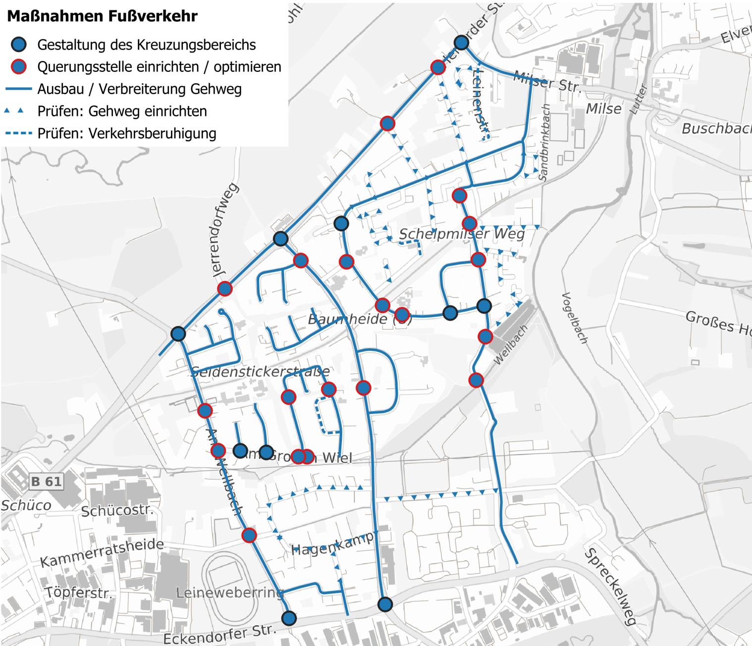 Die Fußverkehrsstrategie sieht verschiedene Maßnahmen in Baumheide vor, beispielsweise: