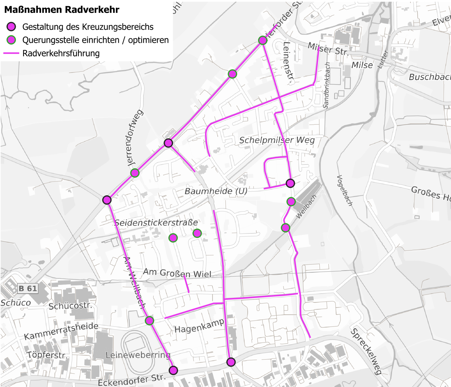 Für die Umsetzung der Mobilitätsstrategie 2030 wurden verschiedene Konzepte erarbeitet. Einzelne Maßnahmen wirken sich auf die Verkehre in Baumheide und damit auch auf die Aufenthaltsqualität im Stadtteil insgesamt aus.